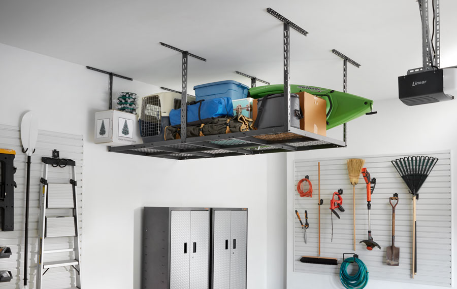 Le scaffalature a soffitto sono perfette per riporre scatole e oggetti stagionali, liberando il pavimento e aumentando lo spazio disponibile.